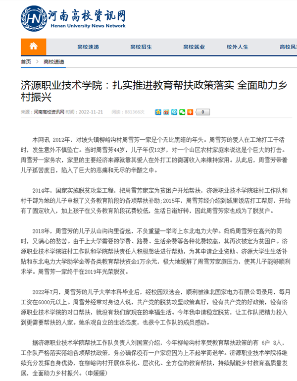 2018年,周雪芳的儿子从山沟沟里奋起,不负重望一举考上东北电力大学。妈妈周雪芳在高兴的同时,又满心的愁苦。由于上大学需要的学费、路费、生活杂费等各种花费较高,其再次被定为贫困户。济源职业技术学院驻村工作队和学院帮扶责任人积极想法进行帮助,为其申请企业资助、济源大学生生活补贴和东北电力大学助学金等各类教育帮扶资金1万余元,极大地缓解了周雪芳家庭压力,使其儿子能够顺利求学。周雪芳一家终于在2019年光荣脱贫。