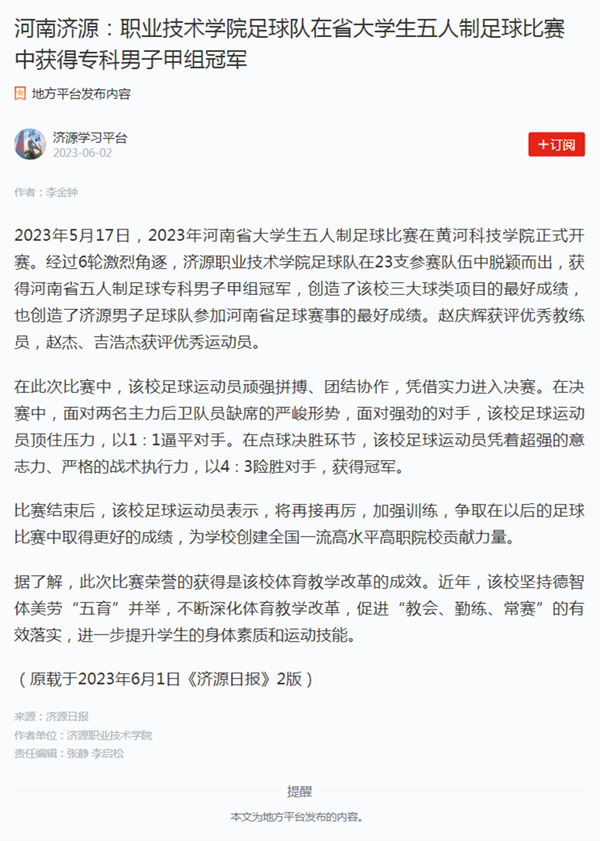 2023年5月17日,2023年河南省大学生五人制足球比赛在黄河科技学院正式开赛。经过6轮激烈角逐,济源职业技术学院足球队在23支参赛队伍中脱颖而出,获得河南省五人制足球专科男子甲组冠军,创造了该校三大球类项目的最好成绩,也创造了济源男子足球队参加河南省足球赛事的最好成绩。赵庆辉获评优秀教练员,赵杰、吉浩杰获评优秀运动员。