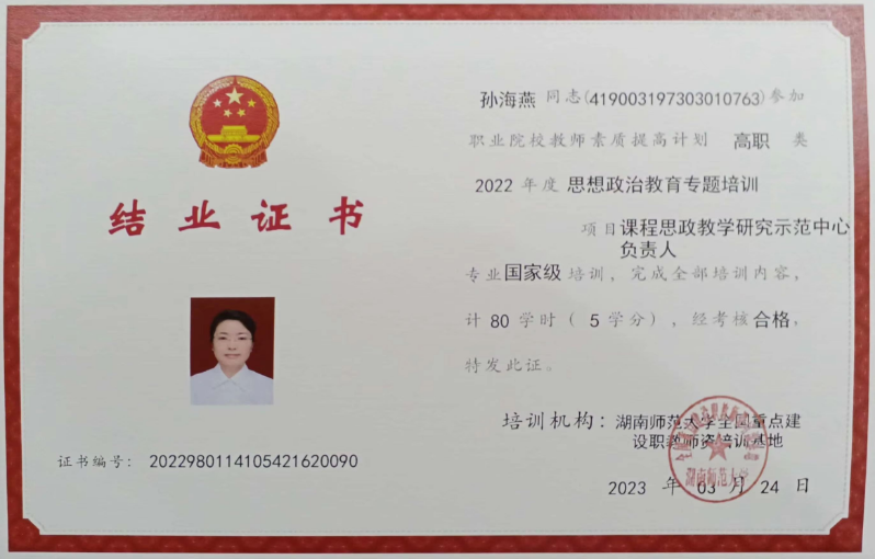 赵艳作为此次培训班的班长,全程躬先表率,积极组织学员认真听讲、分组讨论、展示汇报,在培训综合考核中被评为“优秀学员”。培训结业典礼上,赵艳代表全体学员做总结发言,表示将利用培训所学所见,在推进学校课程思政的建设工作中积极探索,影响和带动学校教师一同爱上课程思政、熟练运用课程思政,提升思政育人效果。
