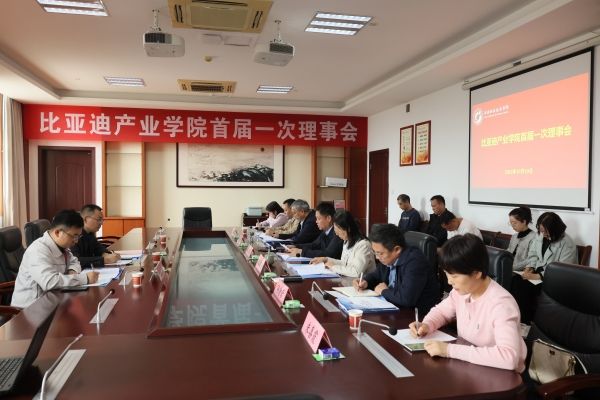 2023年10月19日,比亚迪产业学院召开首届一次理事会,会议选举产生了首届5名理事,讨论通过了理事会章程,研究部署了产业学院2023年招生专业及规模、人才培养方案修订、开放型区域产教融合实践中心建设、专业建设规划等重点工作,就2024年招生、实习就业进行了探讨。