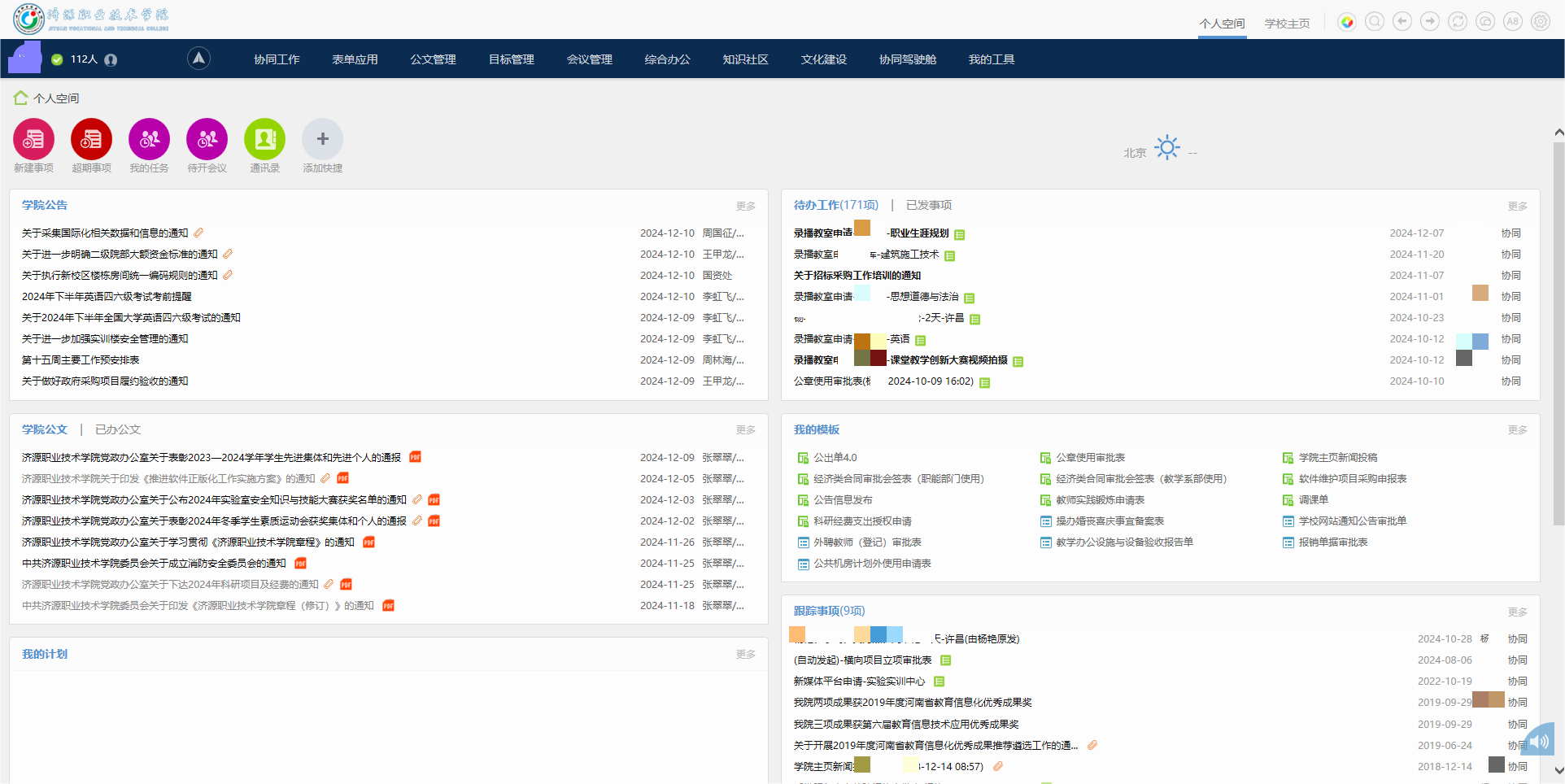 学校0A办公系统推进无纸化信息化办公,简化办事流程,提高办事效率,降低成本,方便查询。目前主要面向在校教师提供服务。应用较多的的服务为调课单,校外实习周报告等。新建及更新协同办公业务流程30多个,现存业务流程80余个。进一步推动了“一网通办”。