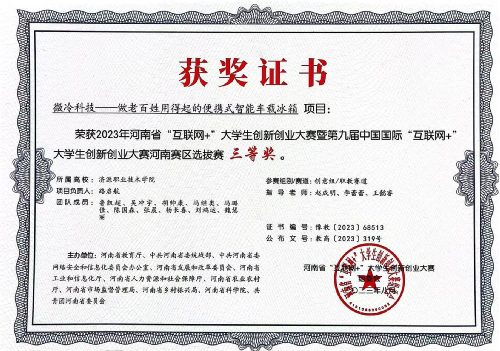 学子在2023年河南省大学生创新大赛职教赛道比赛表现出色,微冷科技——做老板姓用得起的便携式智能车载冰箱项目 在2023年河南省大学生创新大赛职教赛道比赛中荣获等奖,充分展示了我在创新创业教育领域的实力与成果。