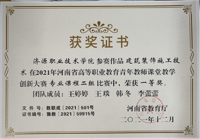 1.在2021年河南省高等职业教育青年教师课堂教学创新大赛专业课程二组比赛中,荣获一等奖。团队成员:王婷婷、王琰、韩冬、李蕾蕾。