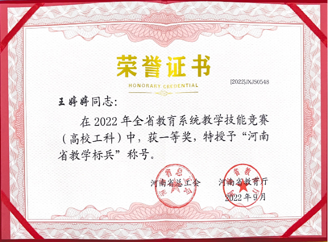 3.王婷婷老师在2022年全省教育系统教学技能竞赛(高校工科)中,获一等奖,特授予“河南省教学标兵”称号。