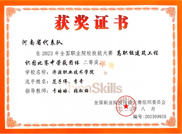4.在2023年全国职业院校技能大赛高职组建筑工程识图比赛中荣获团体 二等奖。
