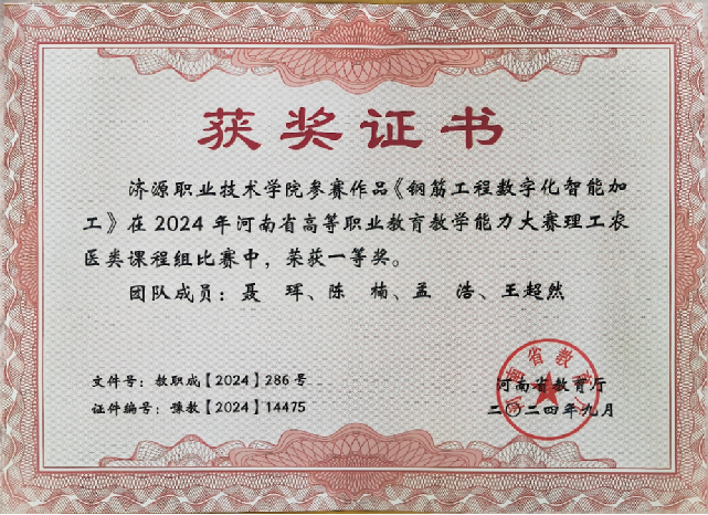 5.济源职业技术学院参赛作品《钢筋工程数字化智能加工》在 2024 年河南省高等职业教育教学能力大赛理工农医类课程组比赛中,荣获一等奖。团队成员:聂 珲、陈 楠、孟 浩、王超然。