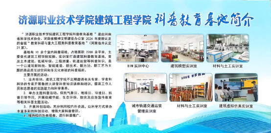 “济源职业技术学院建筑工程学院科普教育基地”是由河南省科学技术协会、河南省精神文明建设办公室2024年度新认定的省级“教育科研与重大工程类科普教育基地”(河南省共认定31家)。