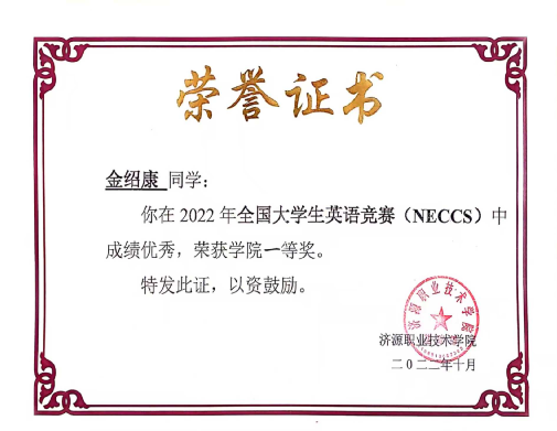 2022学年荣获全国大学生英语竞赛学院一等奖