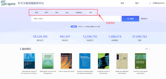 平台提供期刊、学位、会议、科技报告资源的多重维度的导航浏览功能以期刊、学位、会议论文为例。