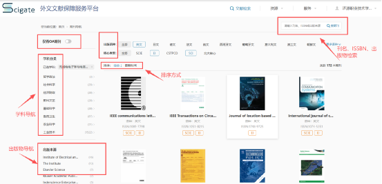 期刊导航支持学科分类、出版来源、出版语种筛选,并可以选择仅查看 OA 期刊。支持刊名、ISSN、出版来源的检索,可按更新时间、首字母进行排序。