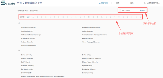 学位导航展示了平台收录的学位文献的学位授予单位,可通过首字母进行筛选查看,支持学校检索。