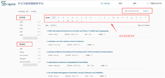 会议导航支持召开年份、举办地点、首字母筛选。支持会议名称和会议地点的检索,可按召开时间进行排序。