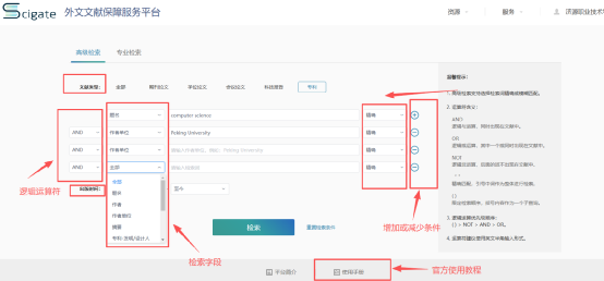 高级检索。检索框的右侧有高级检索的入口,单击进入高级检索界面。用户可以输入逻辑运算符和括号进行检索。高级检索支持多个检索类型、多个检索字段和条件之间的逻辑组配检索,方便用户构建复杂检索表达式。运算符包含“AND”(且)“OR”(或)“NOT”(非)三种。例如:若想要检索北京大学的计算机科学论文,检索式为:题名:computer science AND 作者单位:Peking University