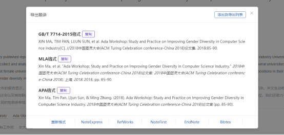 用户点击“导出”按钮,可根据需要导出不同的文献格式。用户可直接导出参考文献,也可将文献加入引用列表,导出页面的文献累积记录,即用户可在检索结果页重复添加文献至导出页面,添加后导出页面自动刷新数据;参考文献格式导出支持期刊、学位、会议、科技报告类型的国家著录标准格式、MLA格式、APA格式、NoteExpress、RefWorks、NoteFirst、Endnote、Bibtex、查新格式的导出。