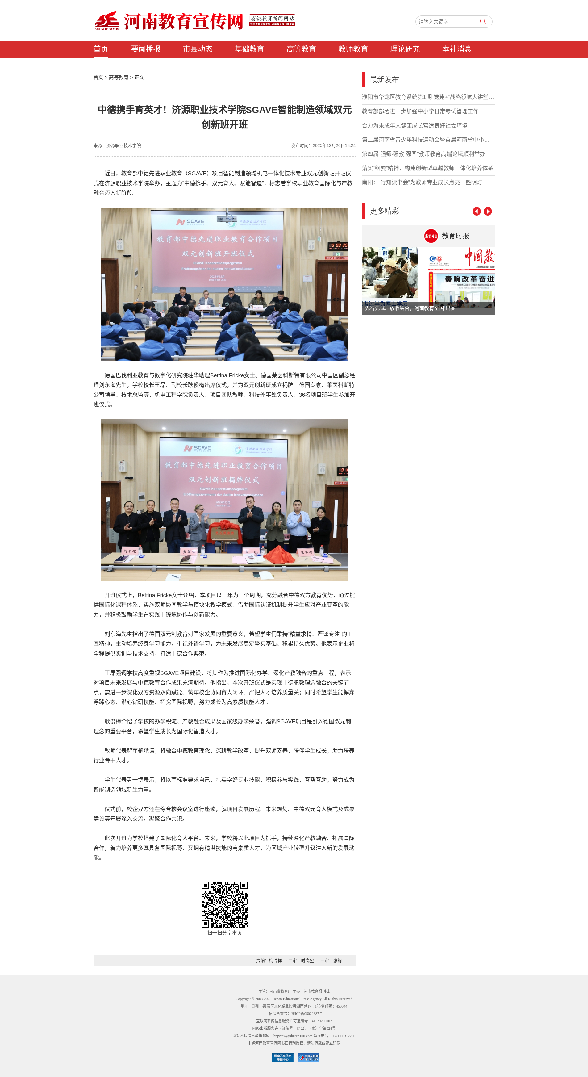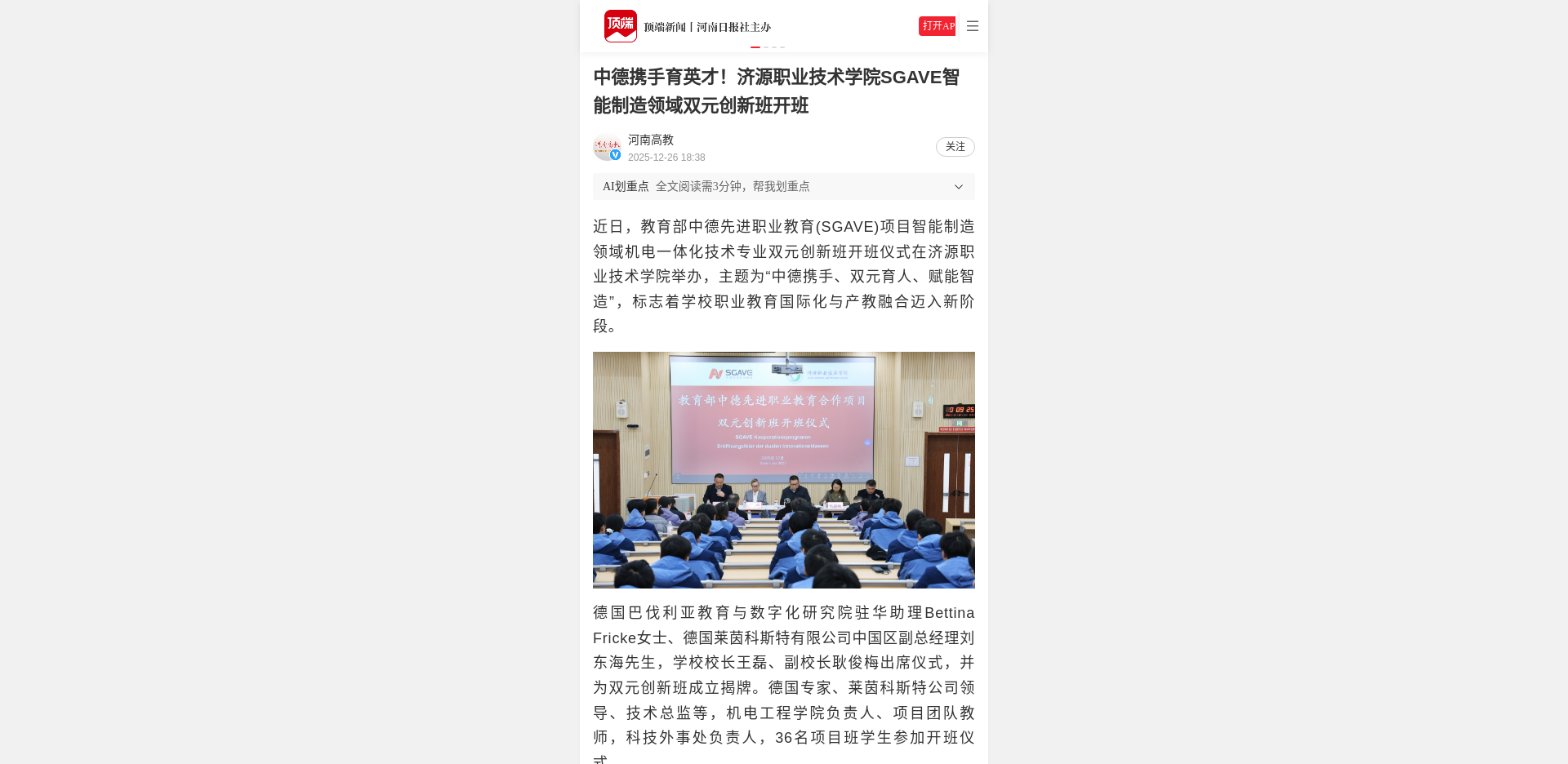 转自2025年12月26日 河南教育宣传网、顶端新闻:中德携手育英才!济源职业技术学院SGAVE智能制造领域双元创新班开班