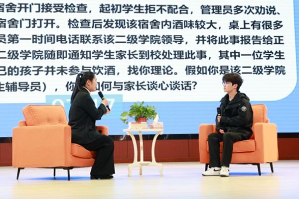 经基础知识测试和班情熟知选拔,共有12名辅导员晋级决赛。决赛采取谈心谈话方式进行,选题均源自实际工作和学生工作痛难点,重点考察辅导员对学生成长成才规律的把握、教育引导能力及解决实际问题的能力。比赛现场互动深入,气氛热烈,辅导员精准把握问题关键和学生需求,以共情建立信任,耐心疏导困惑,深刻分析问题根源与改进措施,展现了扎实的专业能力和深厚的育人情怀。