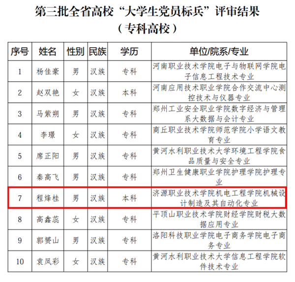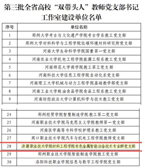 近日,材料工程学院有色金属智能冶金技术专业群党支部成功入选我省第三批高校“双带头人”教师党支部书记工作室建设单位,机电工程学院机械设计制造及其自动化专业程烽桂同学荣获第三批全省高校“大学生党员标兵”荣誉称号。两项荣誉的获得,充分彰显了我校以高质量党建引领高质量育人的显著成效。