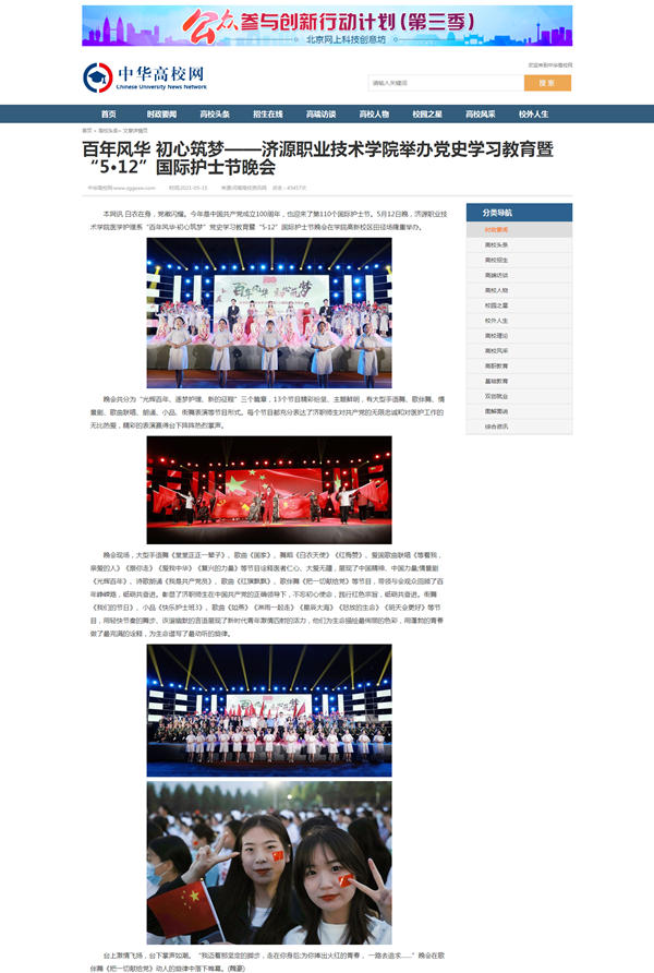 白衣在身,党徽闪耀。今年是中国共产党成立100周年,也迎来了第110个国际护士节。5月12日晚,济源职业技术学院医学护理系“百年风华·初心筑梦”党史学习教育暨“5·12”国际护士节晚会在学院高新校区田径场隆重举办。
