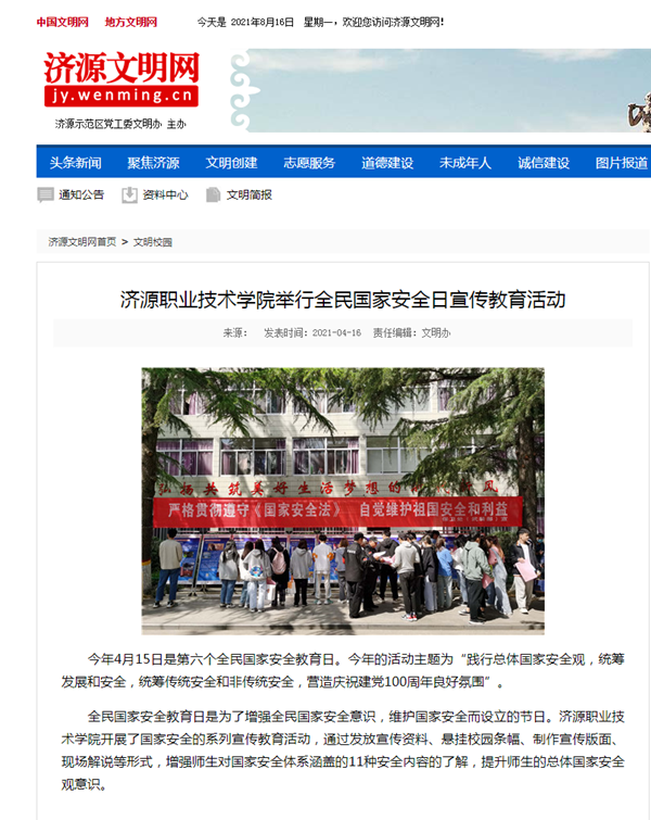 全民国家安全教育日是为了增强全民国家安全意识,维护国家安全而设立的节日。济源职业技术学院开展了国家安全的系列宣传教育活动,通过发放宣传资料、悬挂校园条幅、制作宣传版面、现场解说等形式,增强师生对国家安全体系涵盖的11种安全内容的了解,提升师生的总体国家安全观意识。