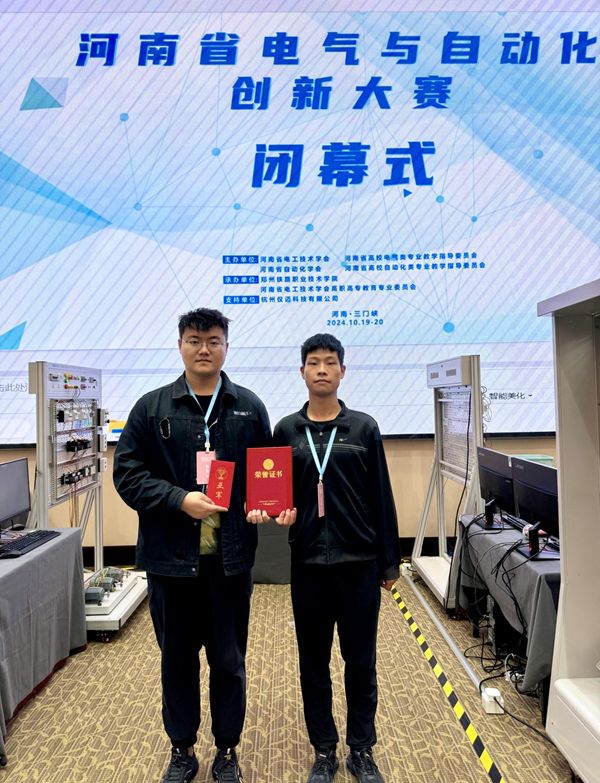 2024年10月20日,2024 年河南省电气与自动化创新大赛在三门峡文博城举行。我校机电工程学院本科2201班的马金富和程烽桂两位同学,凭借扎实的专业知识、精湛的技能水平和出色的团队协作能力,在二十多所本科参赛队伍中脱颖而出,总成绩排名第三,荣获本科组亚军的好成绩。
