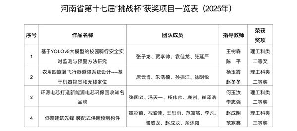 近日,由共青团河南省委、河南省教育厅、河南省社会科学院、河南省科学技术协会、河南省学生联合会联合下发《关于公布第十七届“挑战杯”河南省大学生课外学术科技作品竞赛优秀组织单位、获奖作品的通知》。