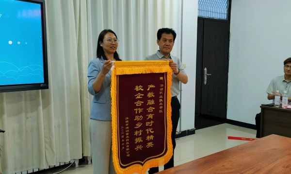 耿俊梅代表学校接收了李文战赠送的《产教融合育时代精英 校企合作助乡村振兴》锦旗。李文战感谢学校通过短视频赋能,助力农产品宣传推广,实现电商惠农,助推乡村振兴。