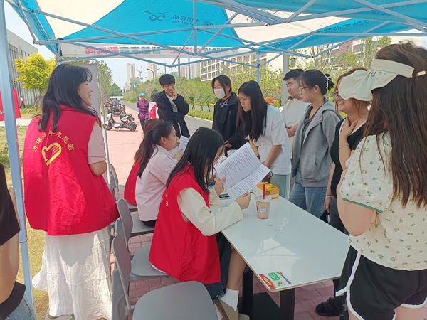 志愿者们分工明确,有人负责宣传,引导路过学生参加活动。有人负责提问问题,由易到难。有人负责分发礼品。有人负责引导学生横幅签字。学生们排队答题,认真思考,积极作答,气氛热烈。活动参与学生达300余人。