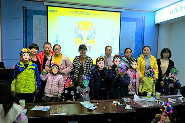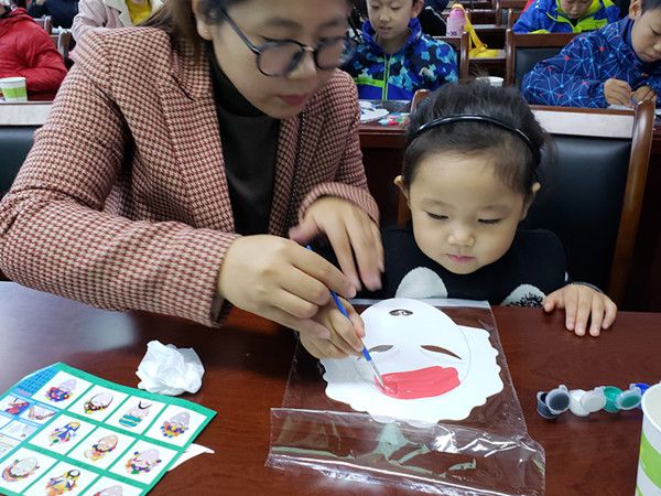 姜老师介绍后,小朋友和家长们一起开始了亲子手工脸谱制作,姜莉老师和教学助手在孩子和家长中穿梭辅导,整个活动在轻松愉悦的氛围中进行。