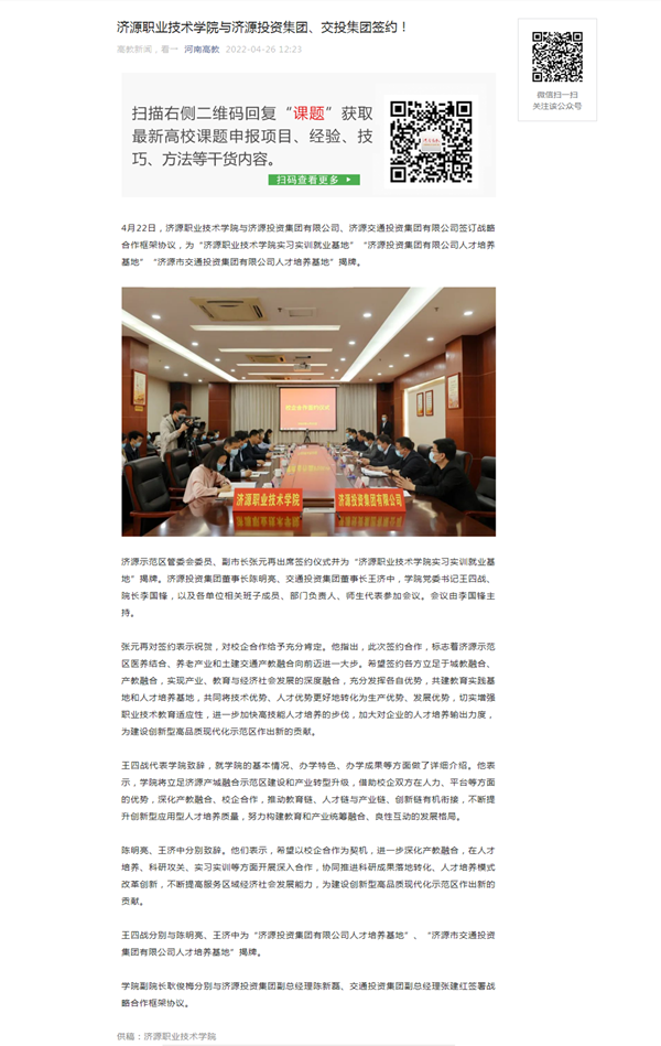 4月22日,济源职业技术学院与济源投资集团有限公司、济源交通投资集团有限公司签订战略合作框架协议,为“济源职业技术学院实习实训就业基地”“济源投资集团有限公司人才培养基地”“济源市交通投资集团有限公司人才培养基地”揭牌。