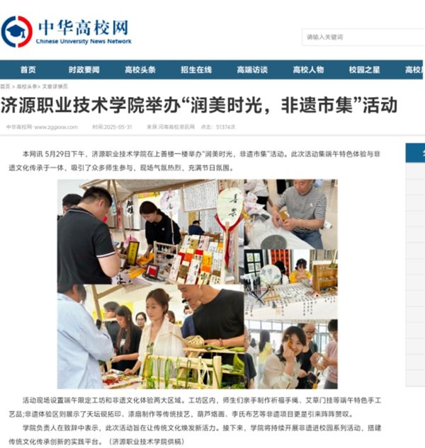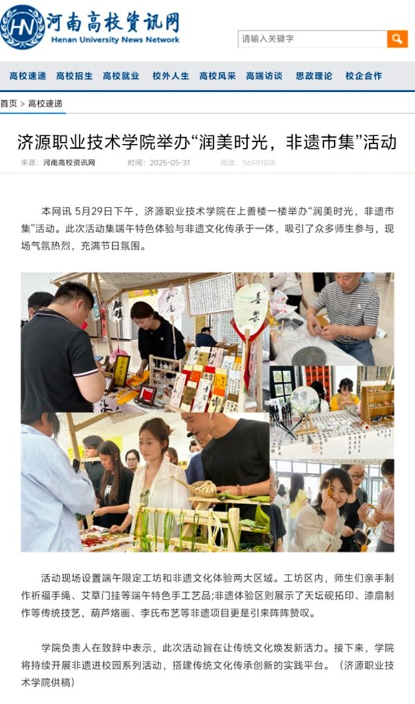 转自2025年5月31日河南高校资讯网、中华高校网:济源职业技术学院举办“润美时光,非遗市集”活动