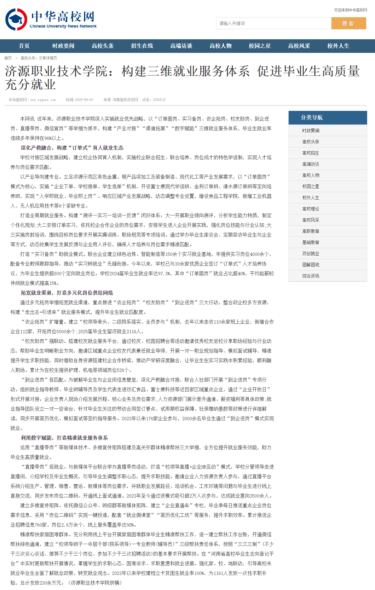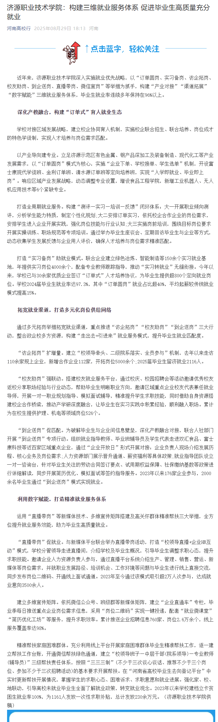 转自2025年9月29日 河南高校资讯网、河南高校行、中华高校网、中新网、新豫网:济源职业技术学院:构建三维就业服务体系 促进毕业生高质量充分就业