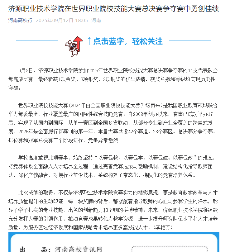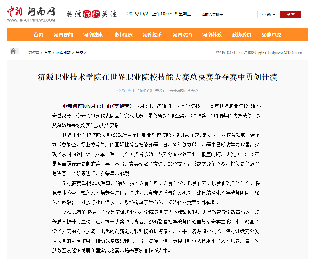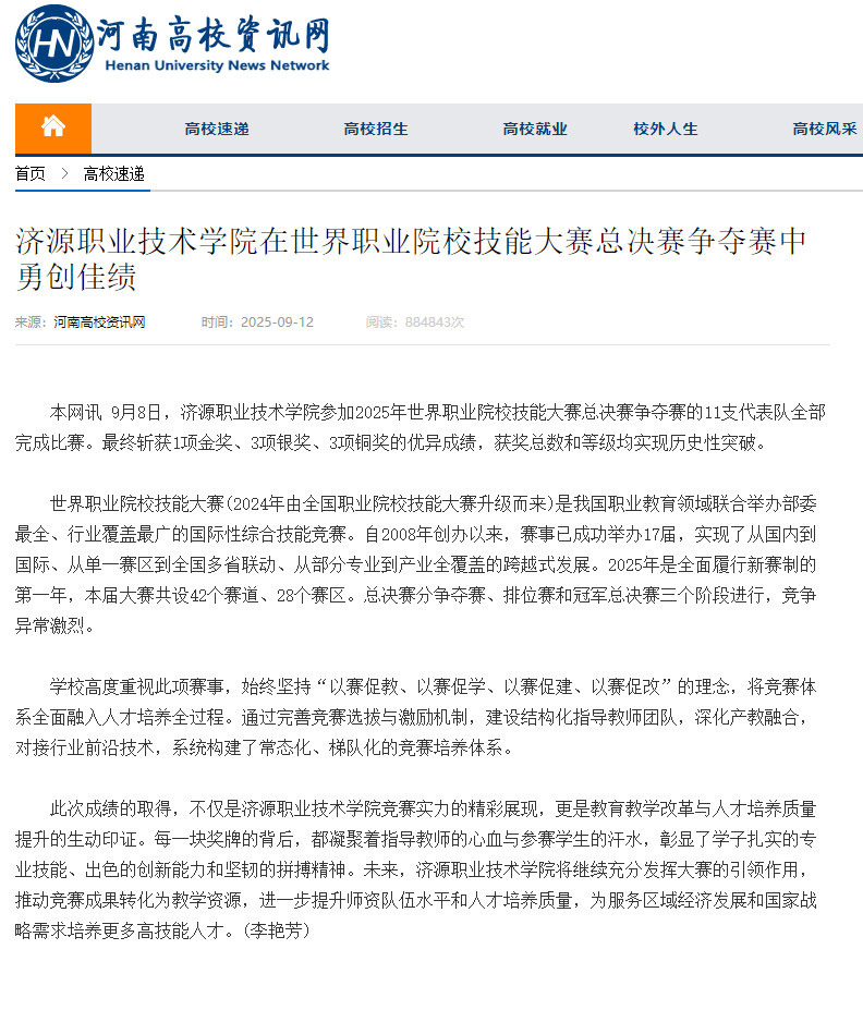 转自2025年9月12日 河南高校资讯网、河南高校行、中华高校网、中新网:济源职业技术学院在世界职业院校技能大赛总决赛争夺赛中勇创佳绩