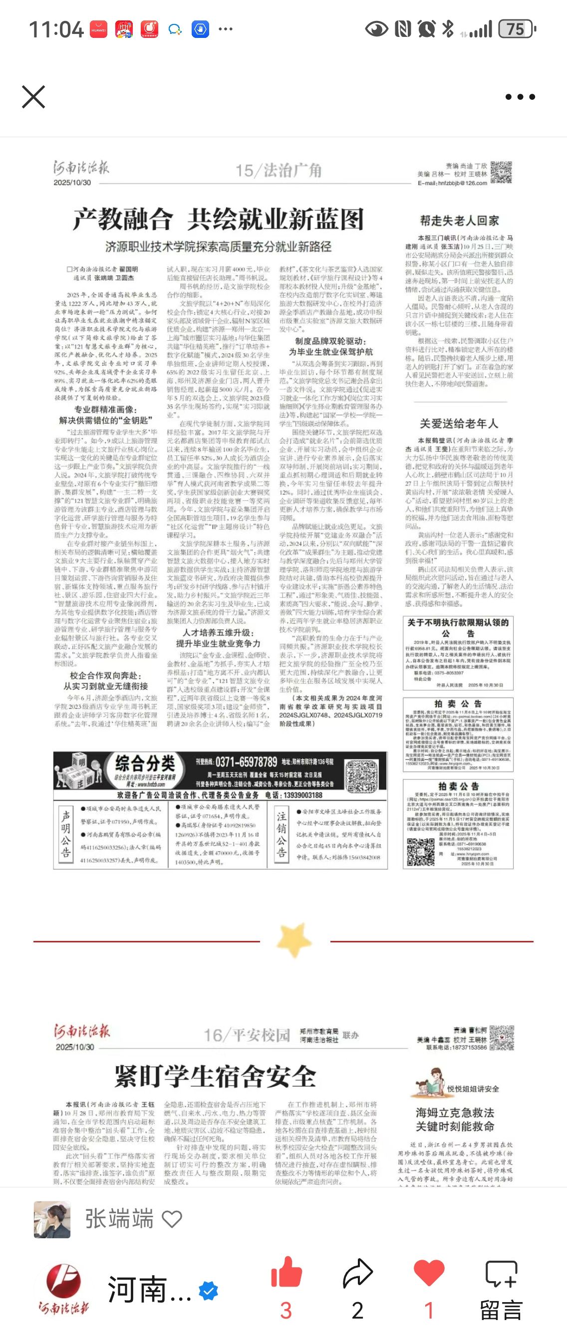 转自2025年10月30日 河南法制报:产教融合共绘就业新蓝图 济源职业技术学院探索高质量充分就业新路径