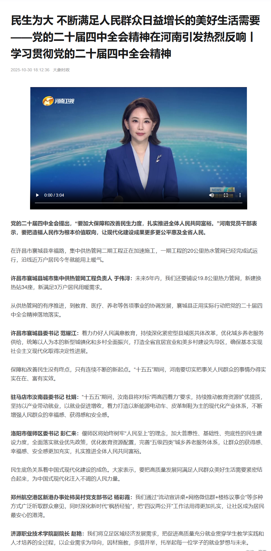 转自2025年10月30日 大象新闻:民生为大 不断满足人民群众日益增长的美好生活需要 ——党的二十届四中全会精神在河南引发热烈反响丨学习贯彻党的二十届四中全会精神