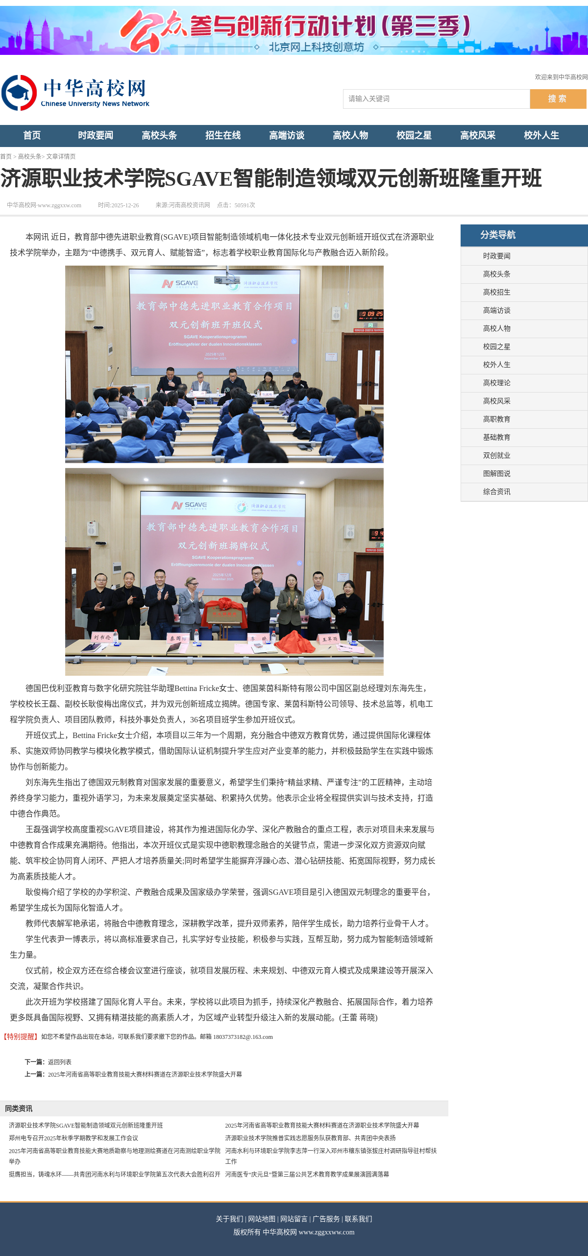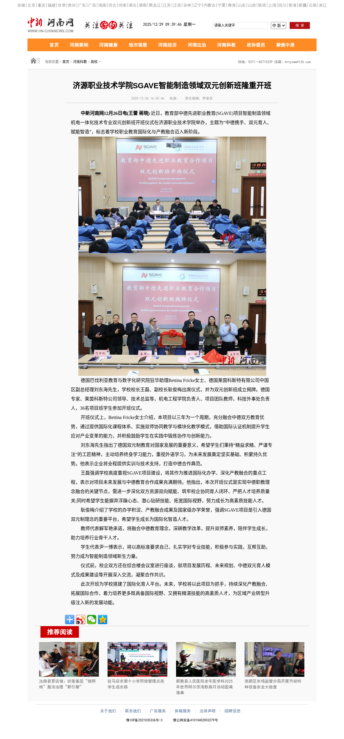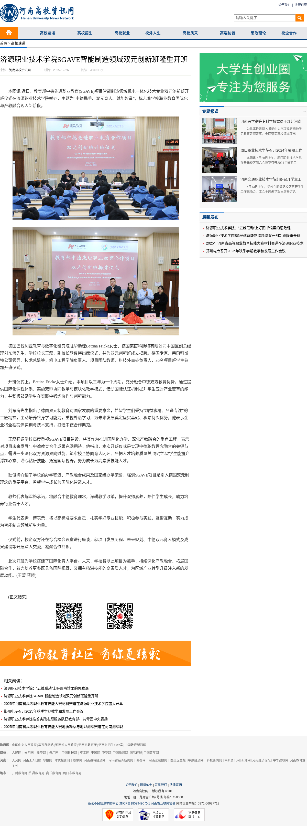 转自2025年12月26日 河南高校资讯网、中华高校网、中新网、河南高校行:济源职业技术学院SGAVE智能制造领域双元创新班隆重开班