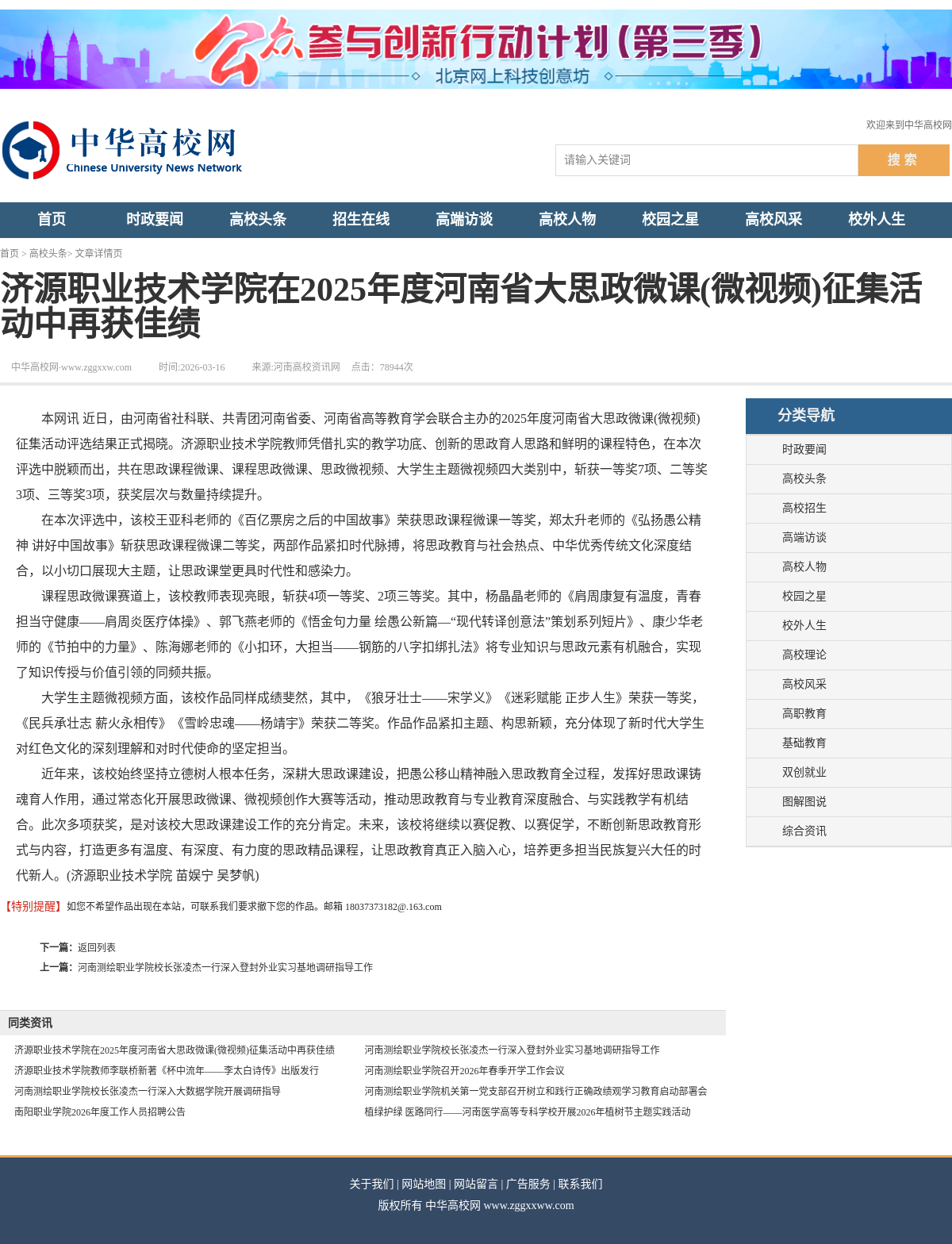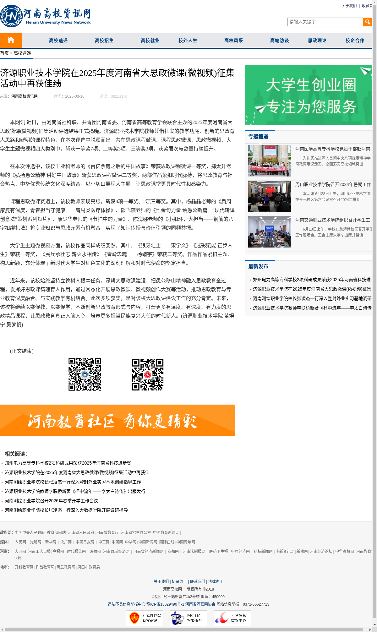 转自2026年3月16日 中华高校网、河南高校资讯网:中华高校网、河南高校资讯网:济源职业技术学院在2025年度河南省大思政微课(微视频)征集活动中再获佳绩