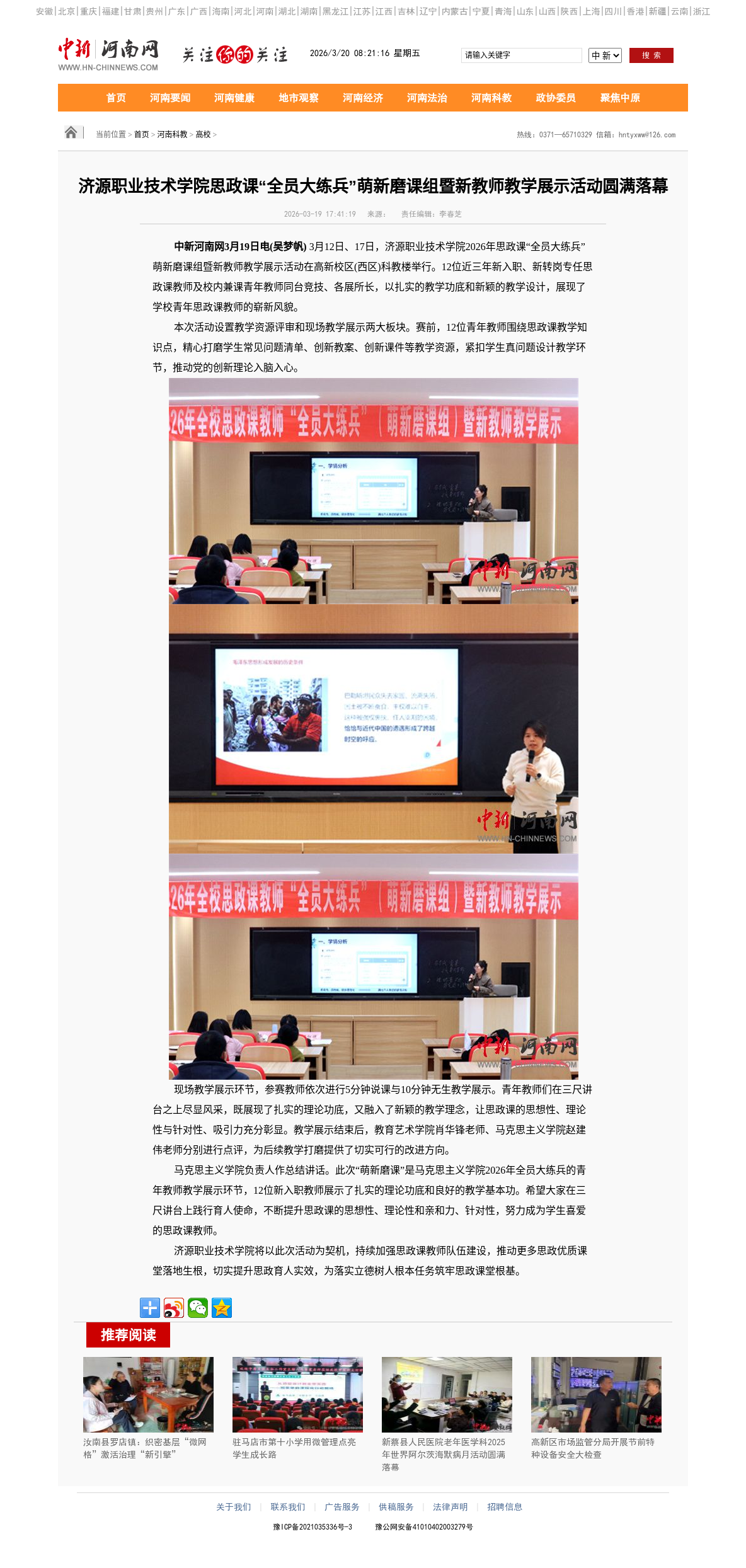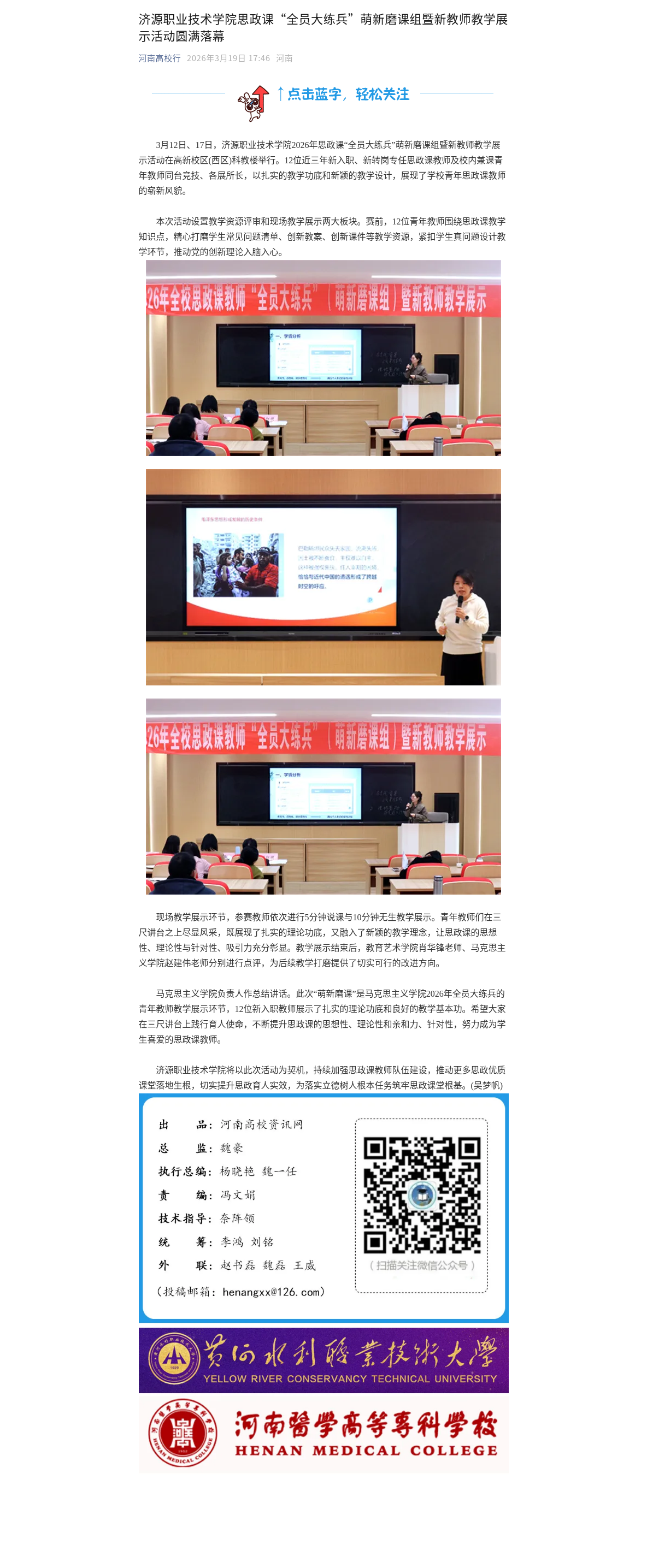 转自2026年3月19日 河南高校资讯网、中华高校网、中新网、河南高校行:济源职业技术学院思政课“全员大练兵”萌新磨课组暨新教师教学展示活动圆满落幕