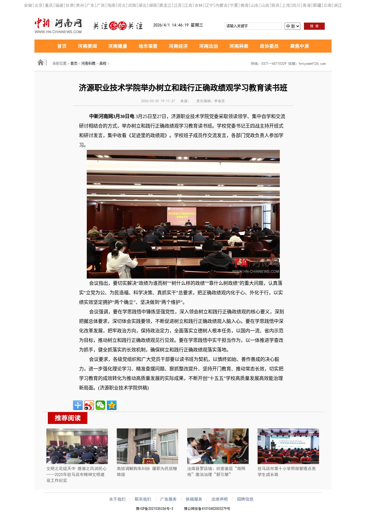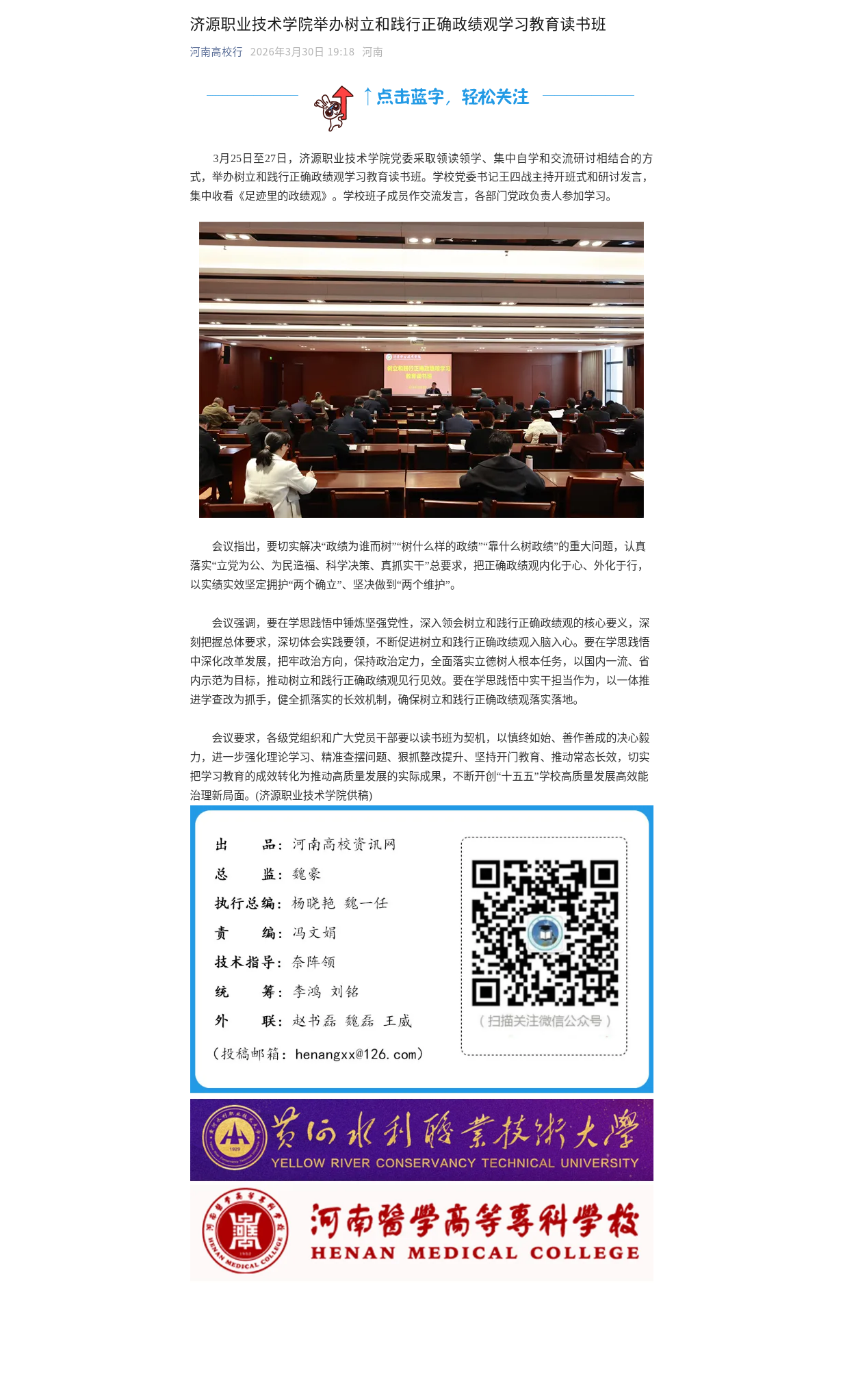 转自2026年3月30日 河南高校资讯网、中华高校网、中新网、河南高校行:济源职业技术学院举办树立和践行正确政绩观学习教育读书班