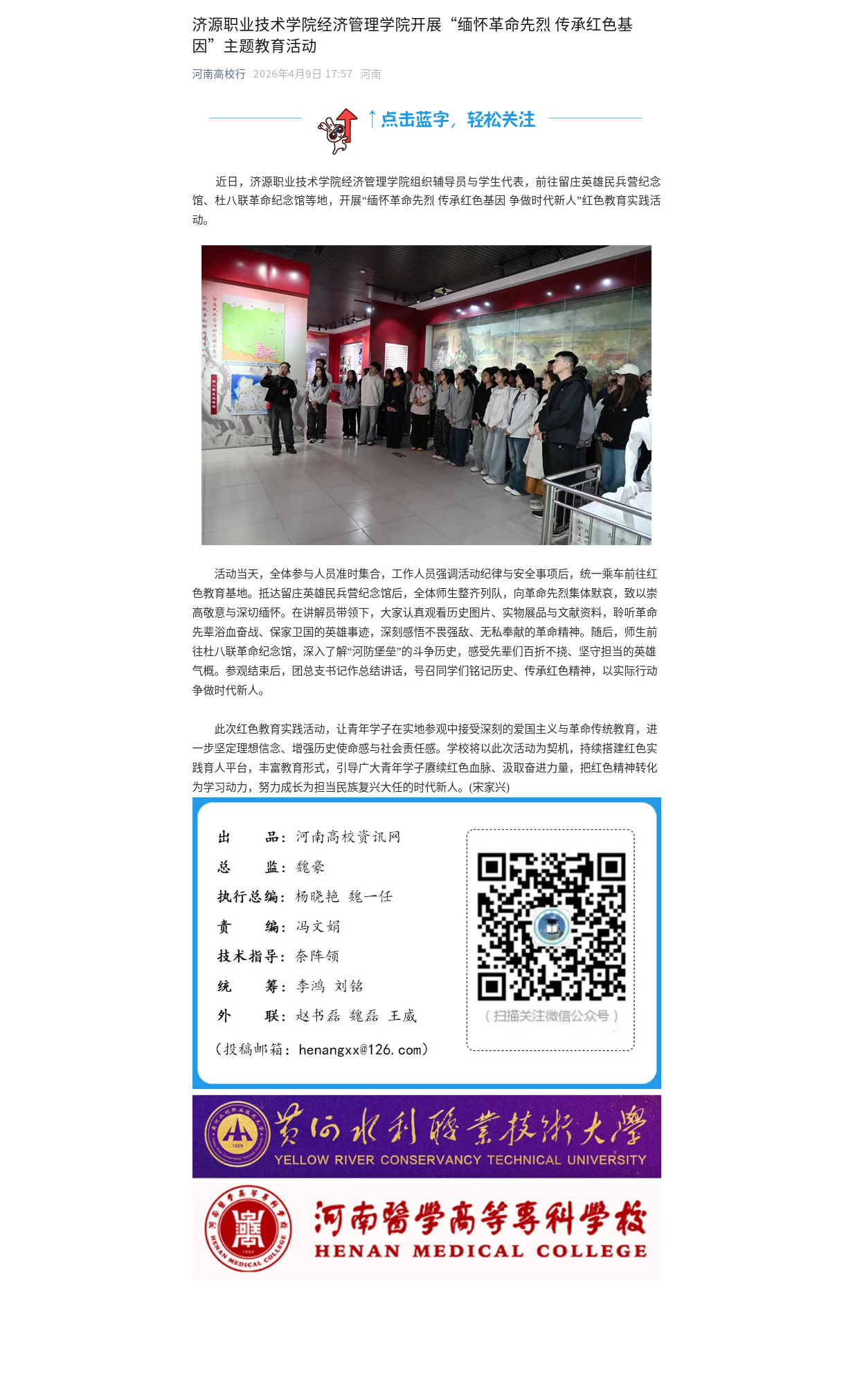 转自2026年4月9日 河南高校资讯网、中华高校网、中新网、河南高校行:济源职业技术学院经济管理学院开展“缅怀革命先烈 传承红色基因”主题教育活动