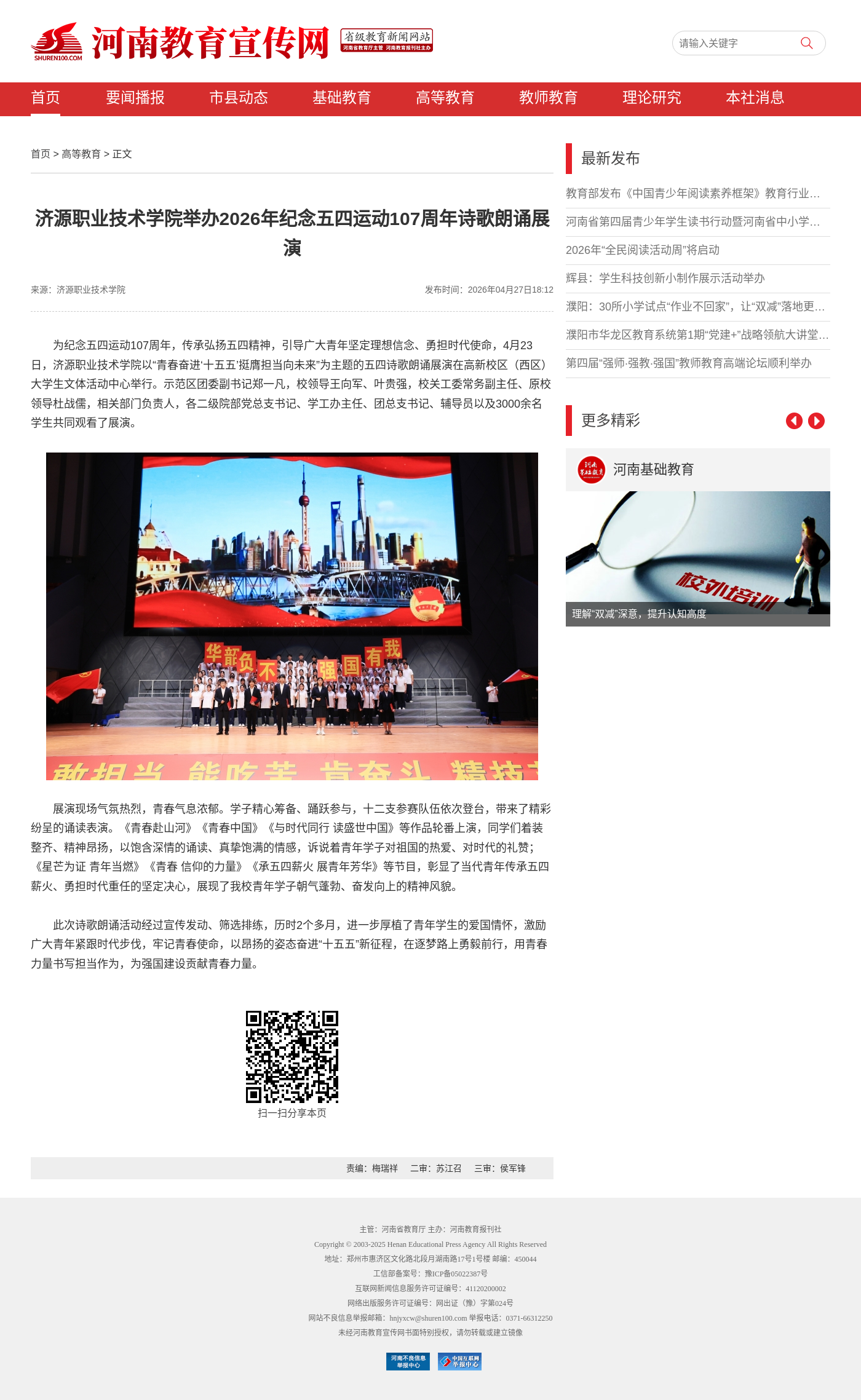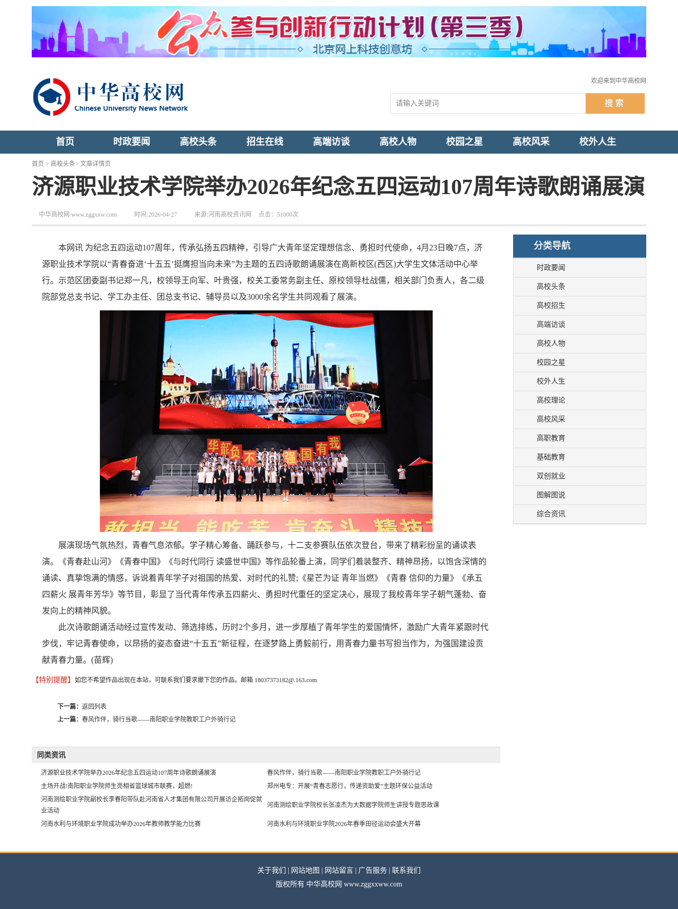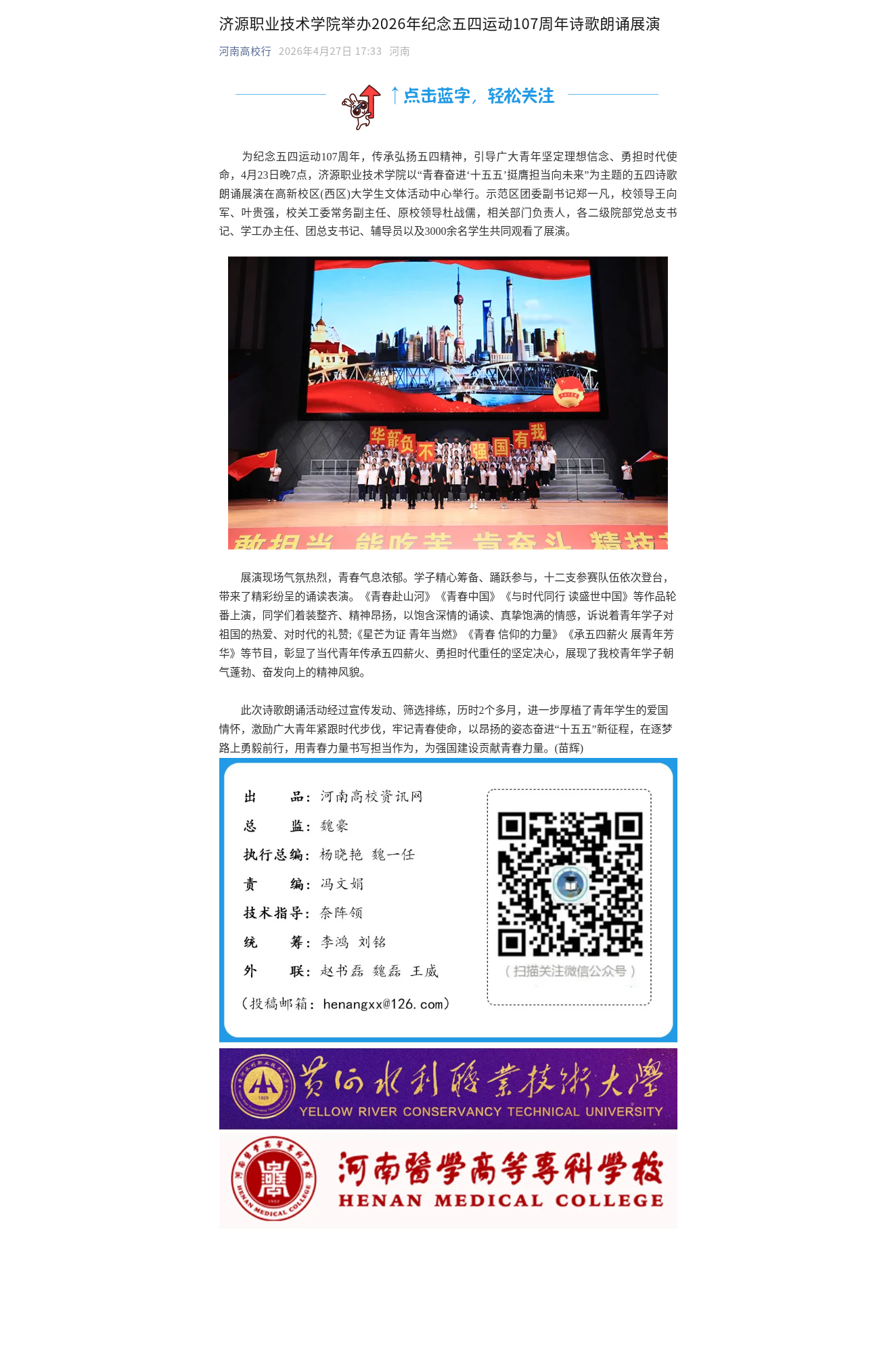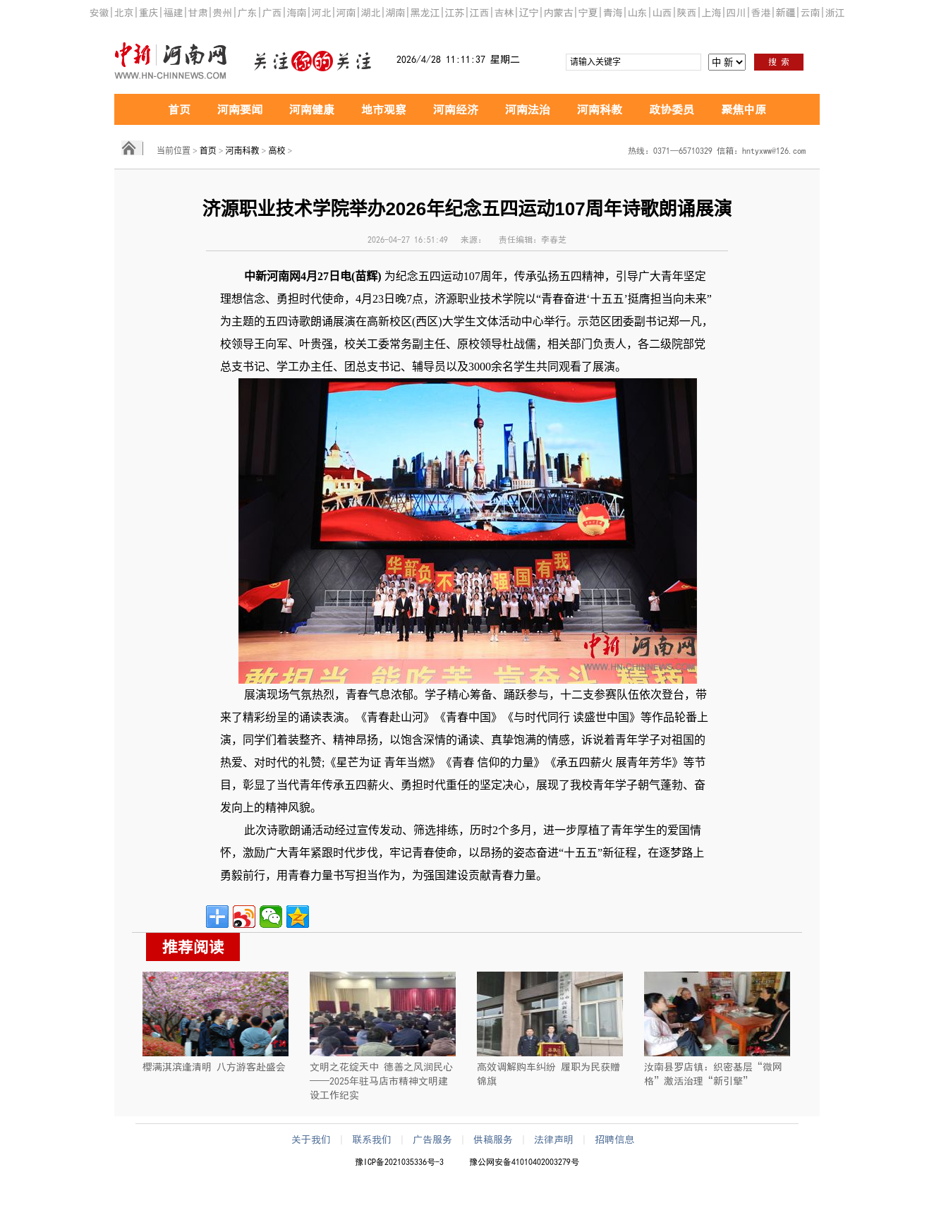 转自2026年4月27日 河南教育宣传网、顶端新闻、河南高校资讯网、中华高校网、中新网、河南高校行:济源职业技术学院举办2026年纪念五四运动107周年诗歌朗诵展演