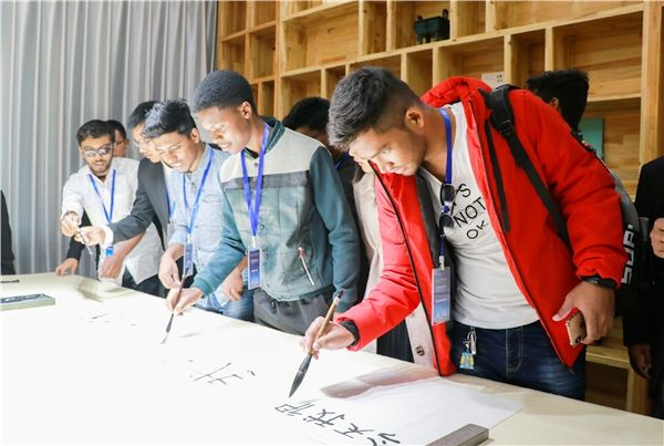 At the Yu Zhonghua Studio, Wang Guozhen, a teacher from the Art Design Department, showcased the brush calligraphy of his elegant piece “High as Mountains and Long as Rivers”,winning great applause from everyone present. The calligraphy works were also presented as gifts to the international students on the spot.