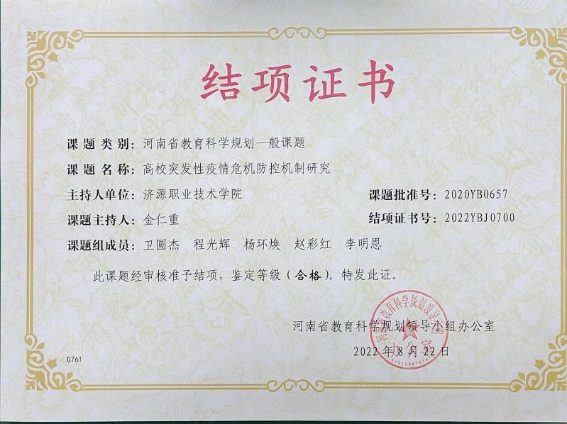 2022.8-《高校突发性疫情危机防控机制研究》厅级课题--金仁重