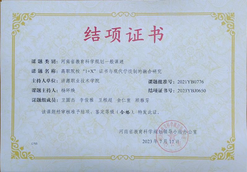 2021.7-《高职院校1+x证书与现代学徒制融合研究》厅级课题--杨环焕