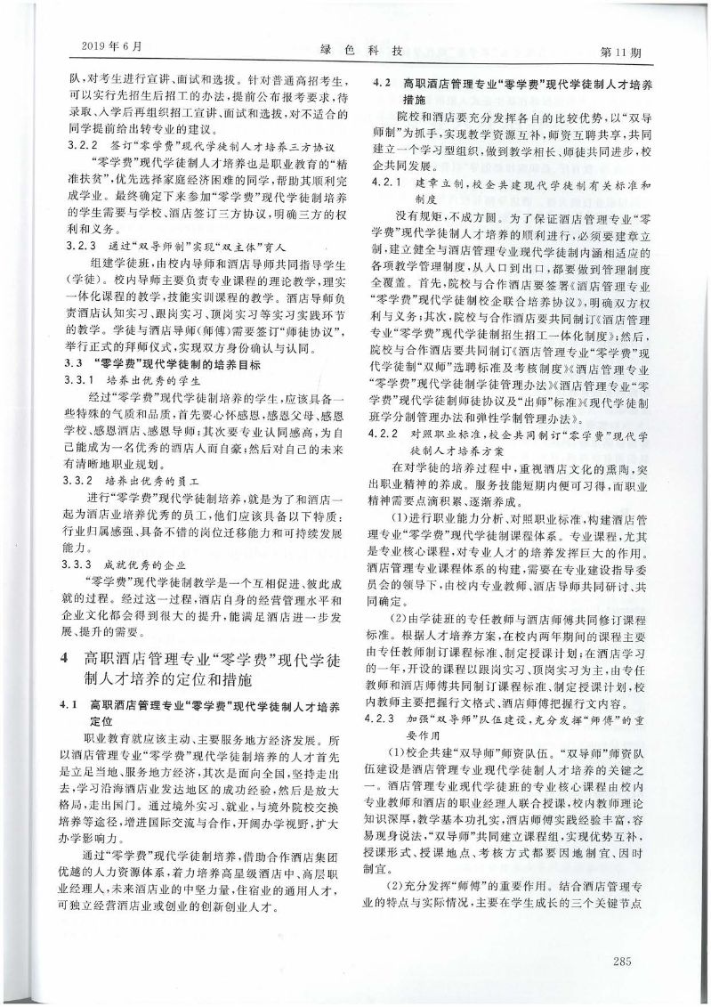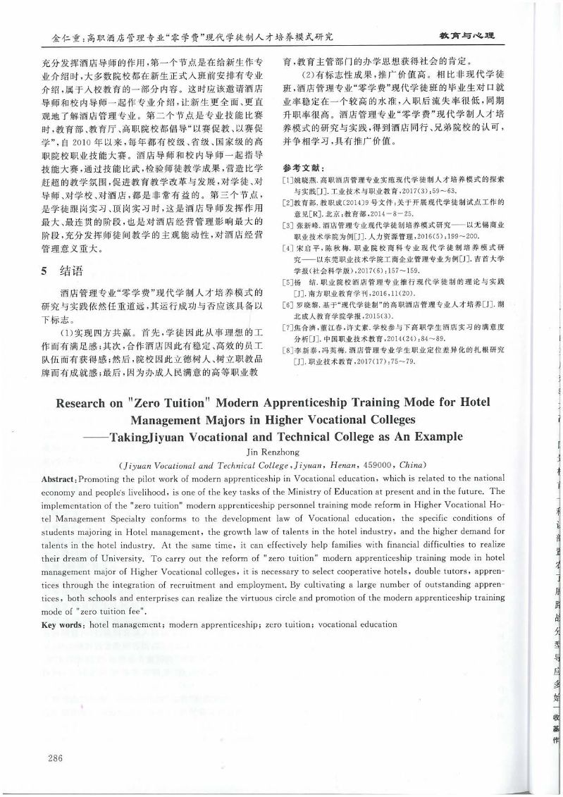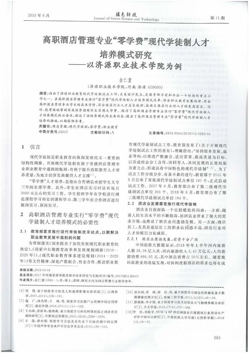 2019.6-绿色科技-高职酒店管理专业“零学费”现代学徒制人才培养模式研究--以济源职业技术学院为例(金仁重)