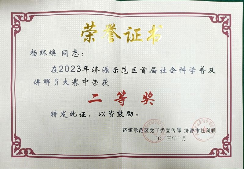 2023年10月,济源示范区首届社会科学普及讲解员大赛二等奖--杨环焕