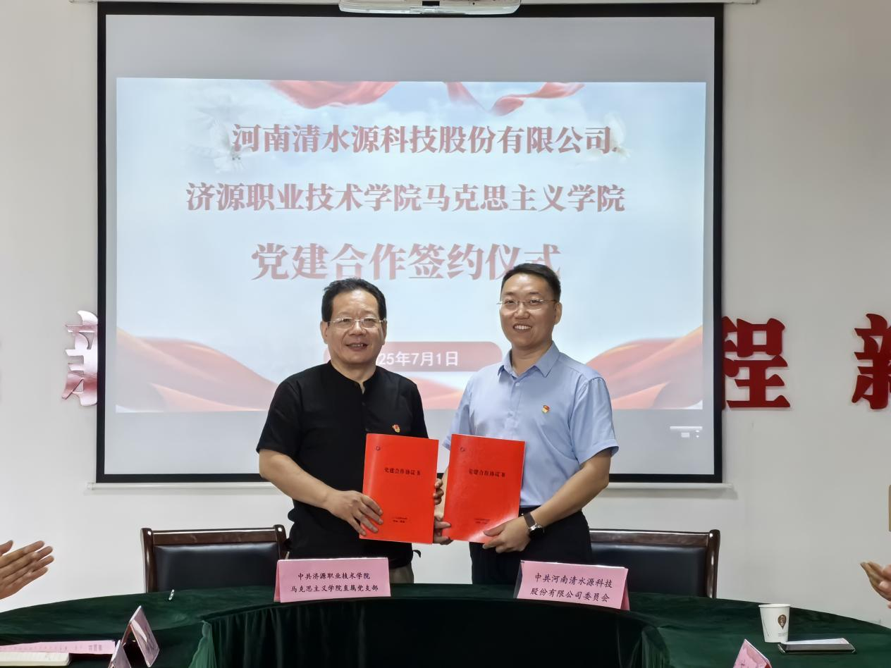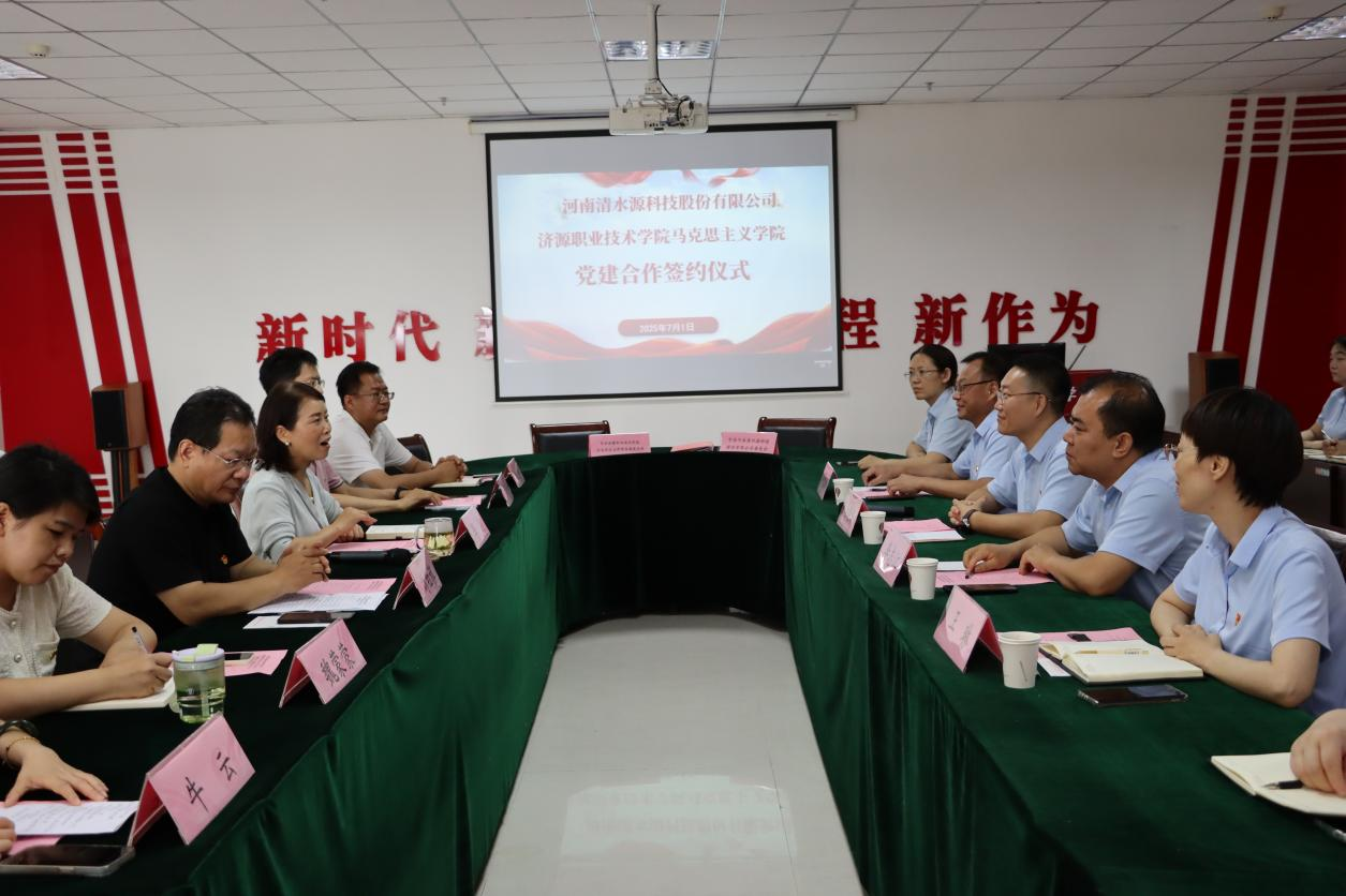 在中国共产党成立104周年之际,7月1日上午,马克思主义学院直属支部委员会与中共河南清水源科技股份有限公司委员会在我校高新校区(西区)科教楼马克思主义学院会议室,签订党建联建合作协议,开展研讨交流。河南清水源科技股份有限公司副总裁兼党委副书记马建伟、副总裁兼党委委员齐文海、副总裁兼工会主席李志江、财务总监王琳及党员代表,马克思主义学院院长李滟、党支部书记刘红旗及全体党员参加了签约仪式。
