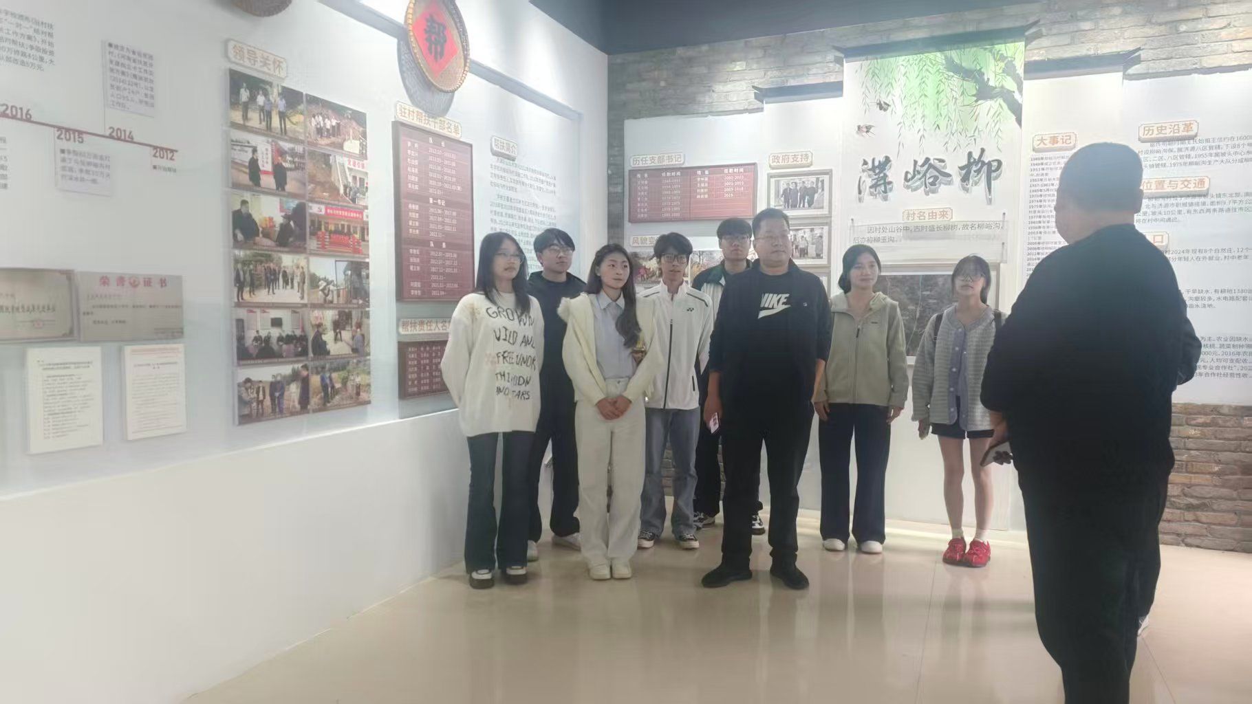 下午两点,柳岭沟村村史馆里,师生们在一件件老物件前驻足。"这些展品就像时光的见证者,默默讲述着这个小山村从贫困到振兴的奋斗故事。"驻村干部指着墙上的照片娓娓道来:从泥泞小路到水泥大道,从破旧土房到崭新民居,从单一耕作到多元产业......这些变化让抽象的政策在同学们眼前活了起来。