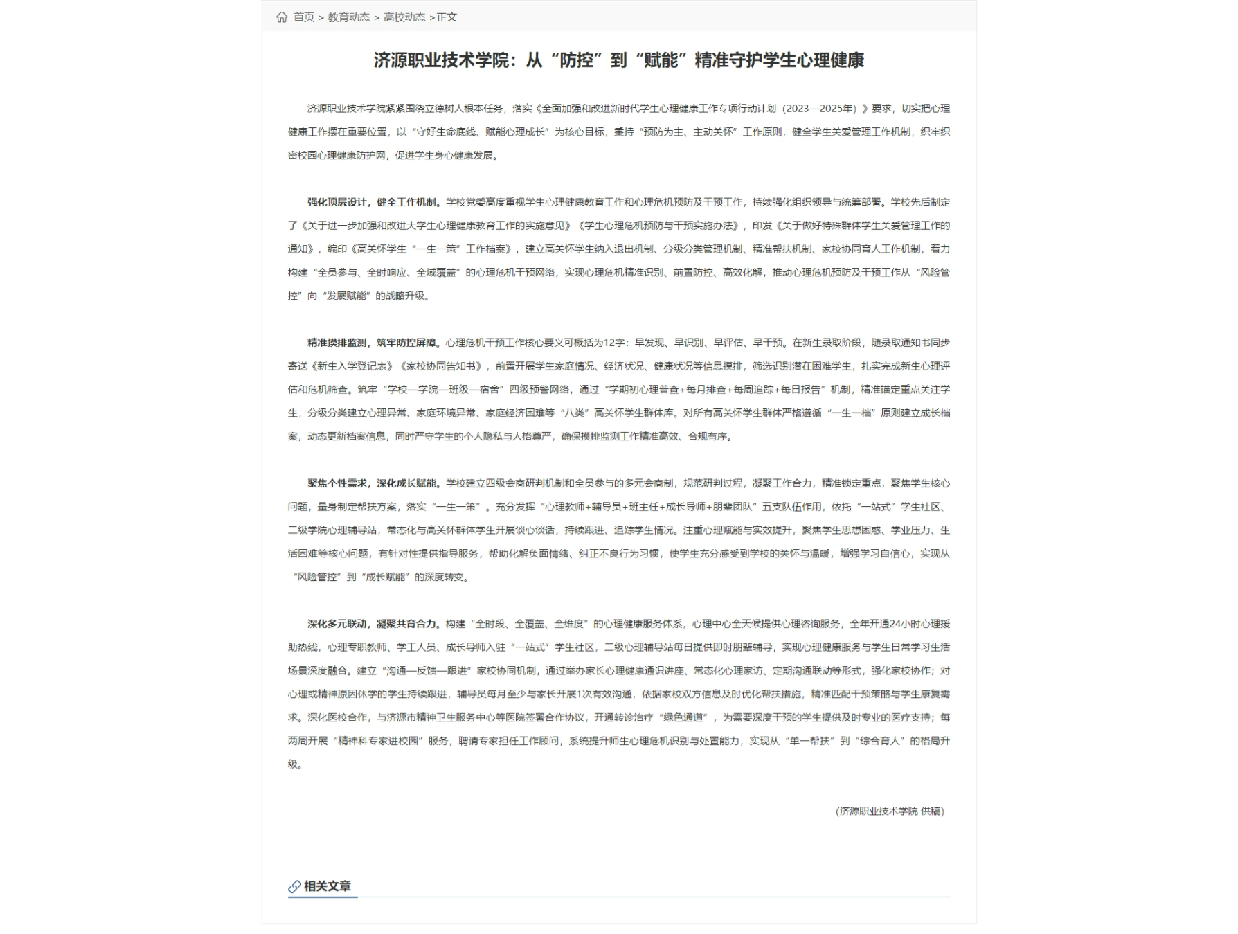 转自2025年11月12日 河南省教育厅:济源职业技术学院:从“防控”到“赋能”精准守护学生心理健康