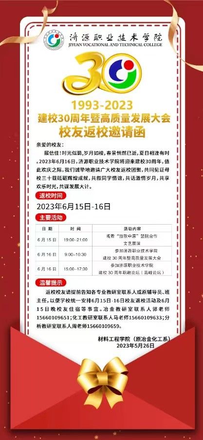 济源职业技术学院建校30周年邀请函(材料工程学院)