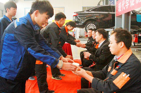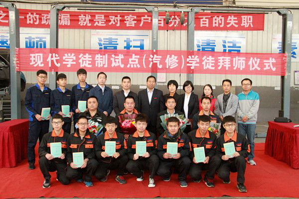 拜师仪式上,学徒向他们的师傅献花敬茶,行鞠躬礼,师傅们则回赠了《弟子规》和《员工手册》。学徒代表、师傅代表、企业代表分别进行了表态发言。最后电气工程系主任武亚代表学院进行了发言,他希望学徒们把握机遇,尊敬师傅,虚心接受师傅的教导,精炼技术,把自己培养成为汽车维修行业的精英工匠;希望师傅们关心爱护徒弟的成长,尽自己所能传道授业解惑;希望企业和学院在现代学徒制试点工作中紧密合作,发挥各自优势,不断完善双主体育人机制,为企业、为社会培养更多的工匠精英。